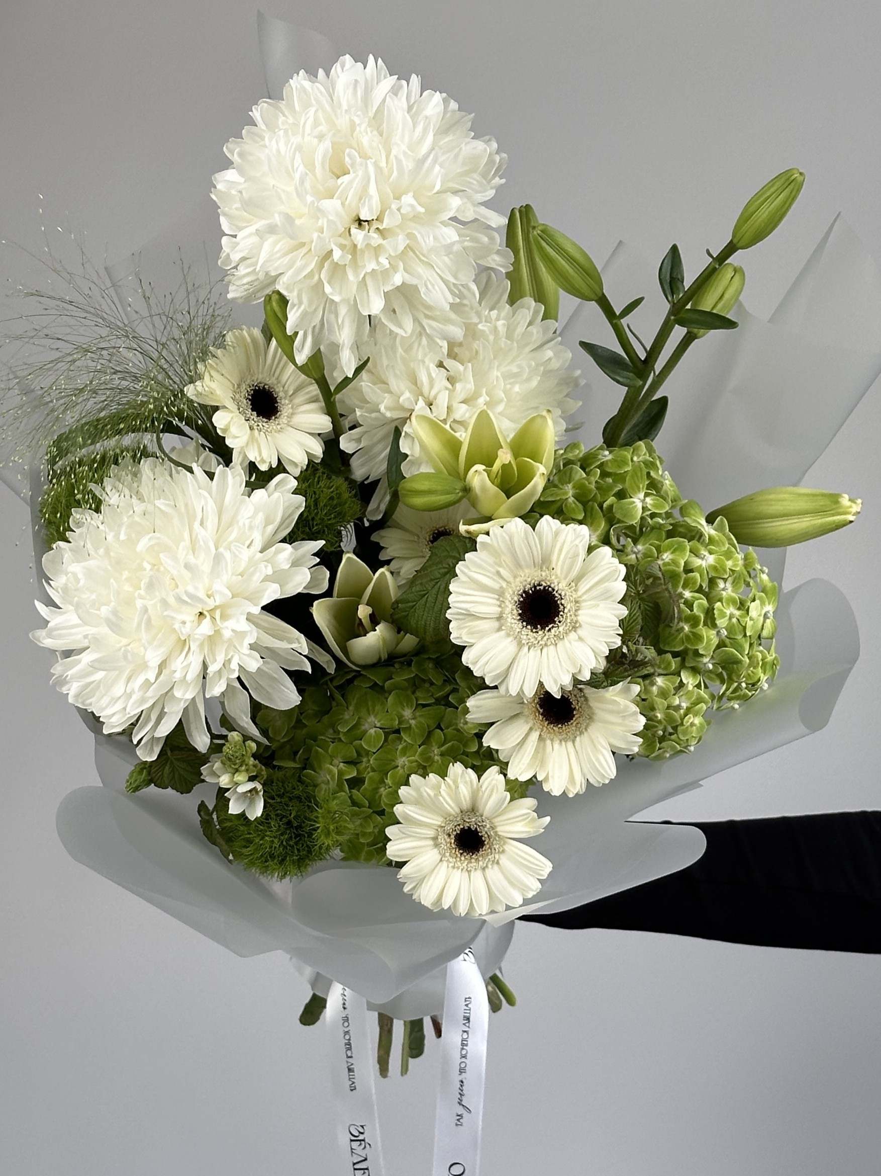 В составе | Гвоздика ,Гермини ,Гортензия ,Лилия ,Малина ,Орнитогалум ,Паникум ,Хризантема |