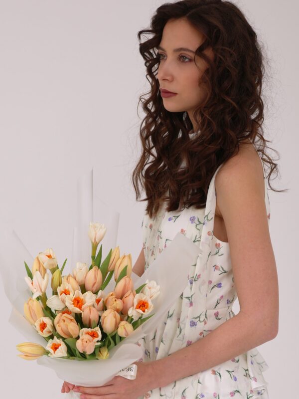 | В составе | Вибурнум, Гвоздика, Ирис, Нарцисс, Пионовидные тюльпаны, Ранункулюс, Форзиция, Эвкалипт |