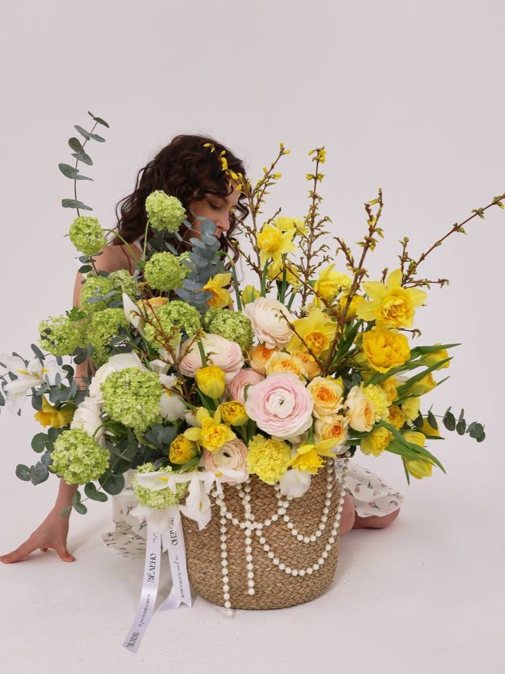 | В составе | Вибурнум ,Гвоздика ,Ирис ,Нарцисс ,Пионовидные тюльпаны ,Ранункулюс ,Форзиция ,Эвкалипт |