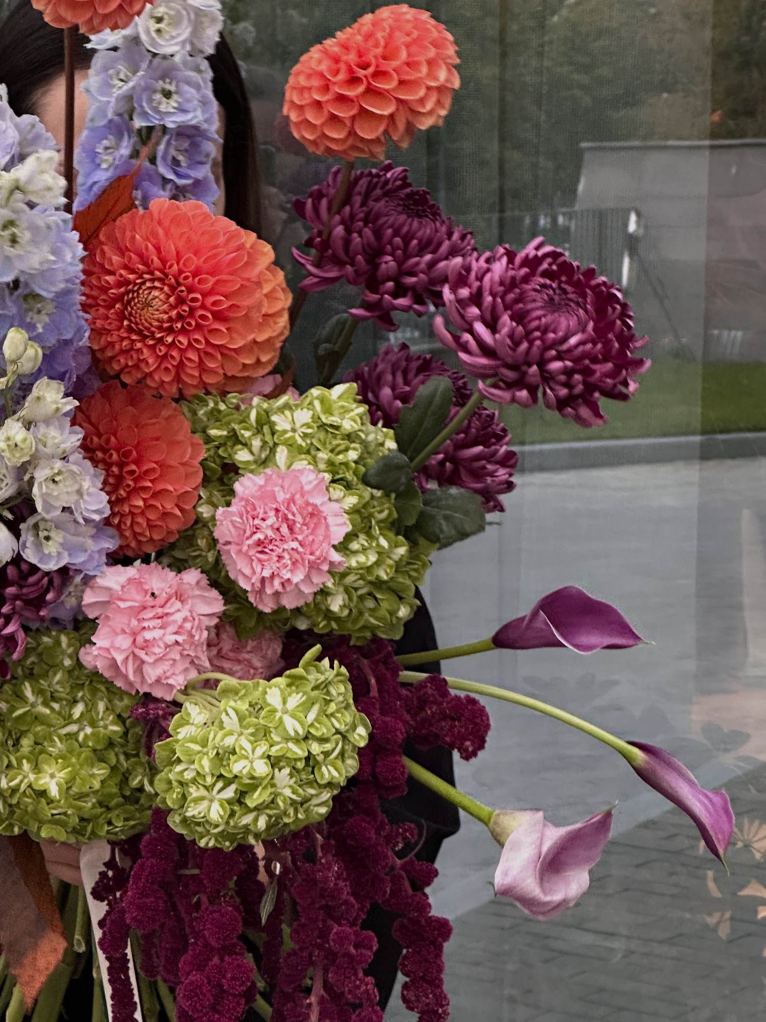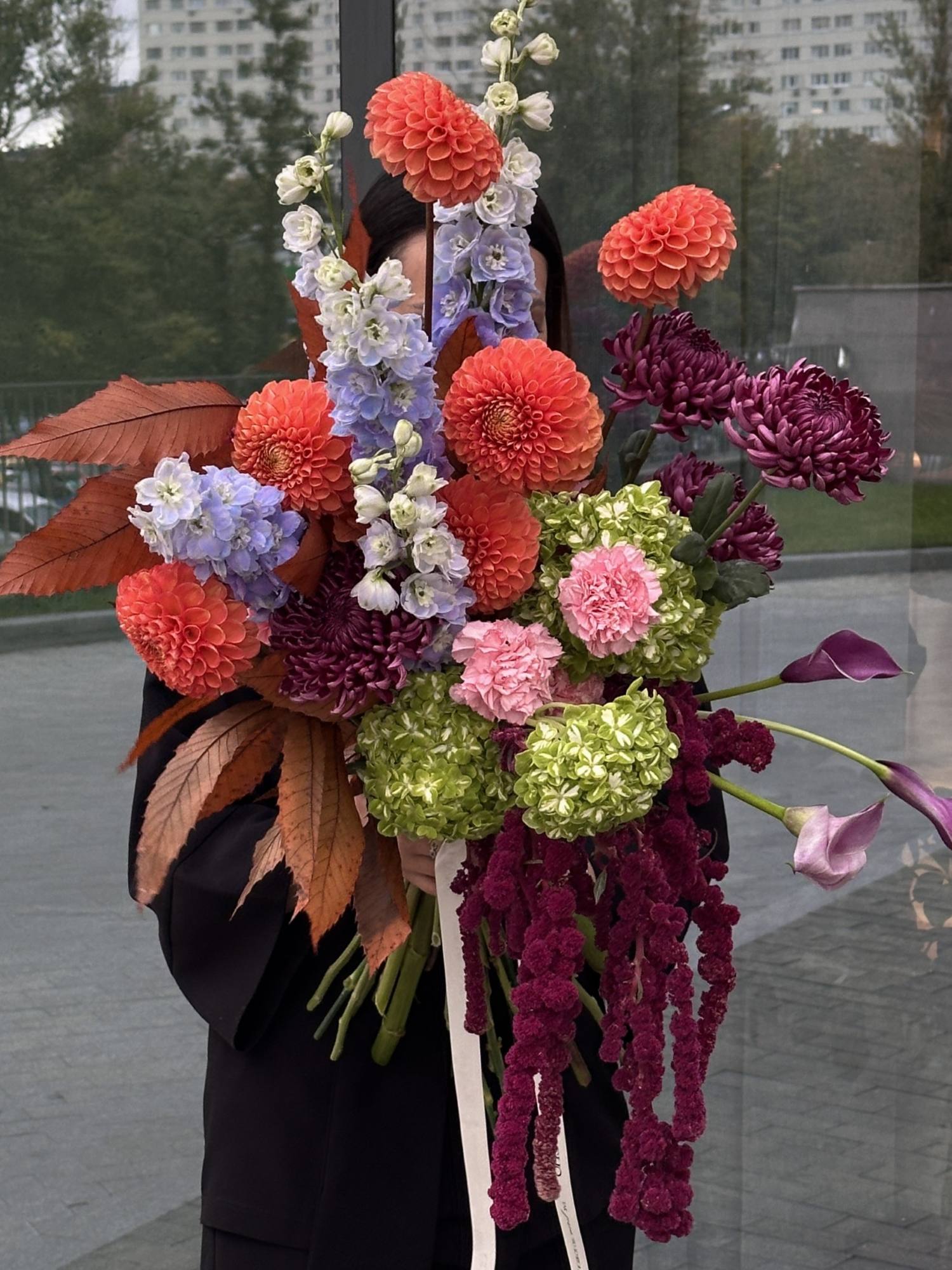 В составе | Амарант ,Гвоздика ,Георгин ,Гортензия ,Дельфиниум ,Калла ,Листья каштана ,Хризантема |