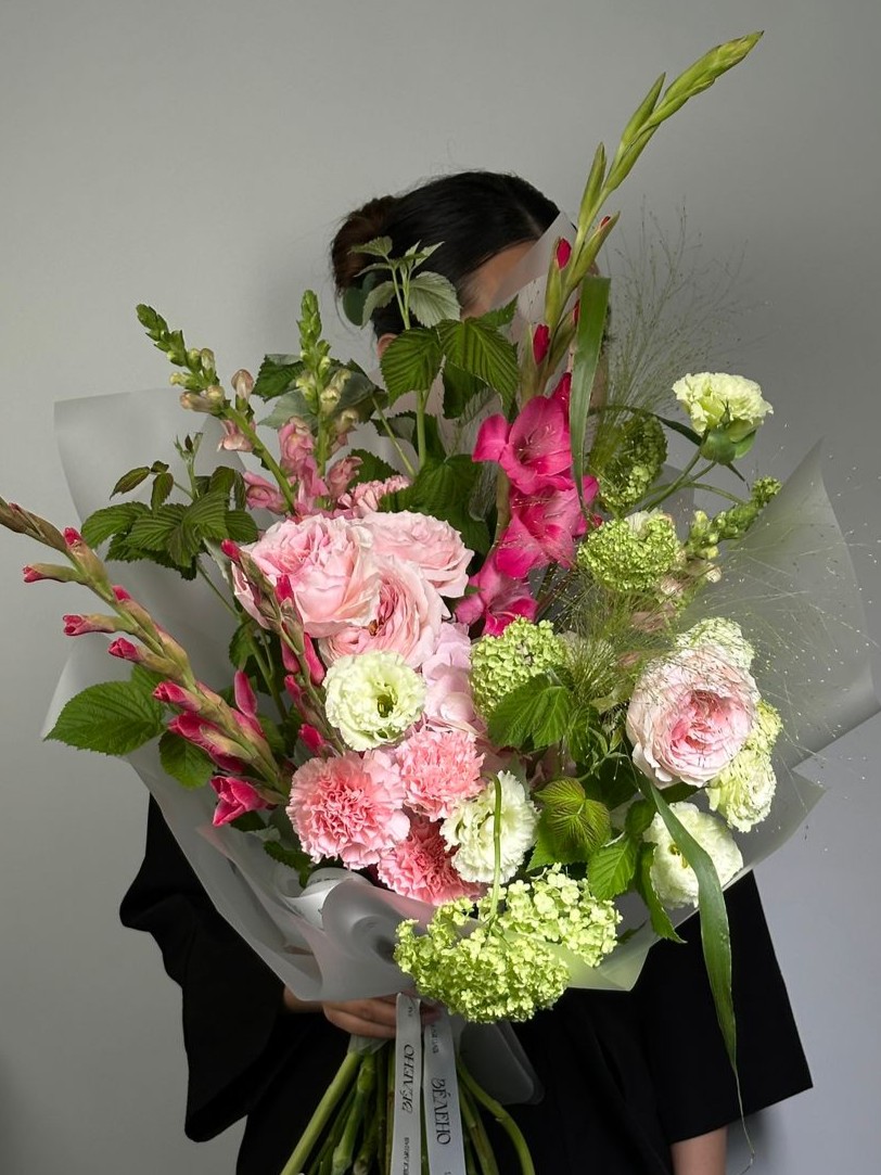 В составе: лизиантус, гортензия, роза пионовидная, леувенбек, малина, гвоздика, гладиолус, паникум, вибурнум.