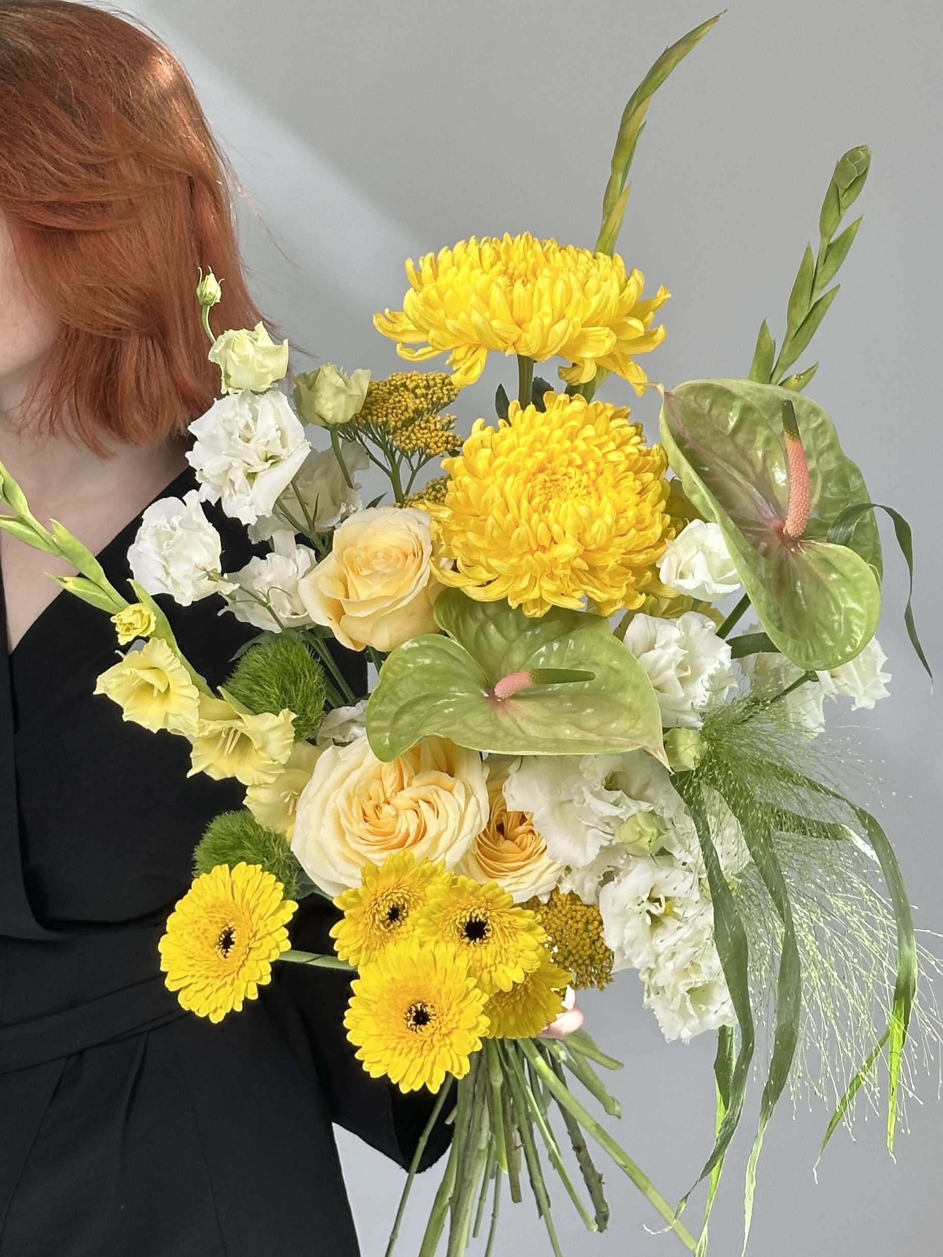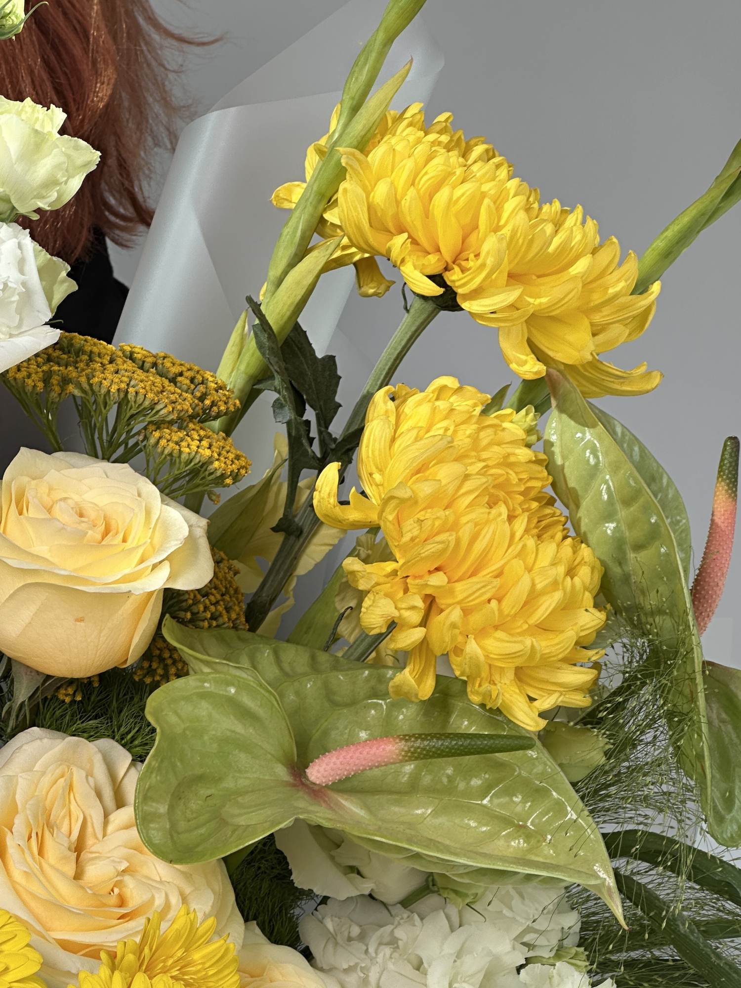 В составе | Антуриум ,Гвоздика ,Гербера ,Гладиолус ,Лизиантус (эустома) ,Паникум ,Роза пионовидная ,Хризантема |