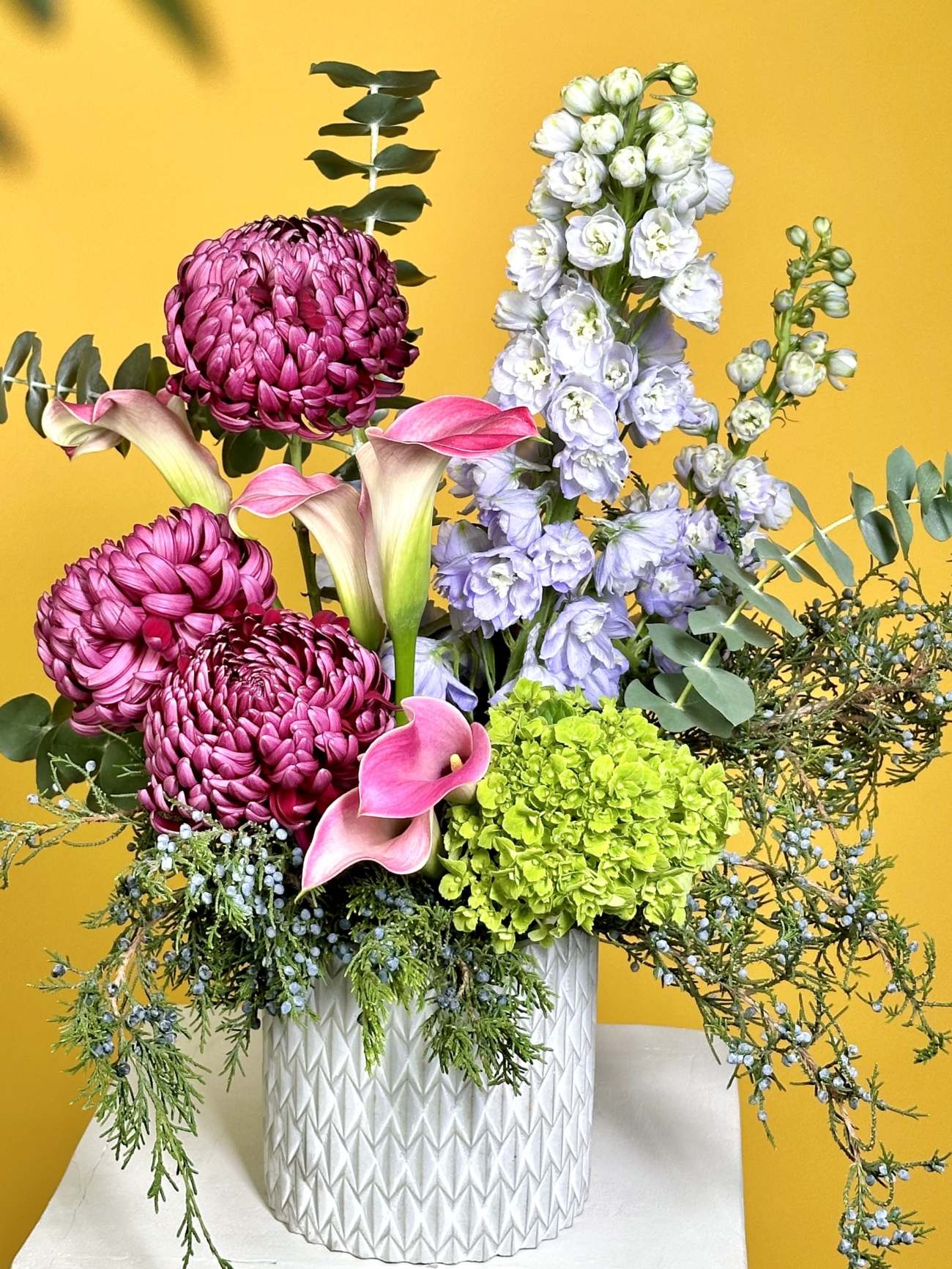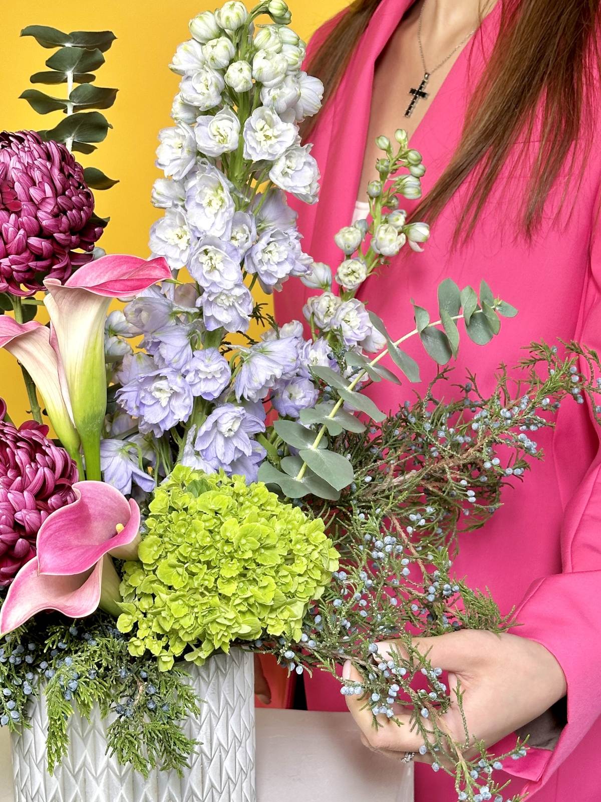 | В составе | Гортензия ,Дельфиниум ,Калла ,Можевельник ,Хризантема ,Эвкалипт |