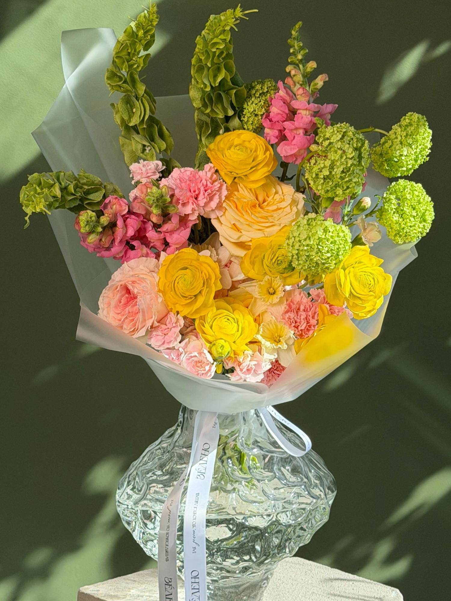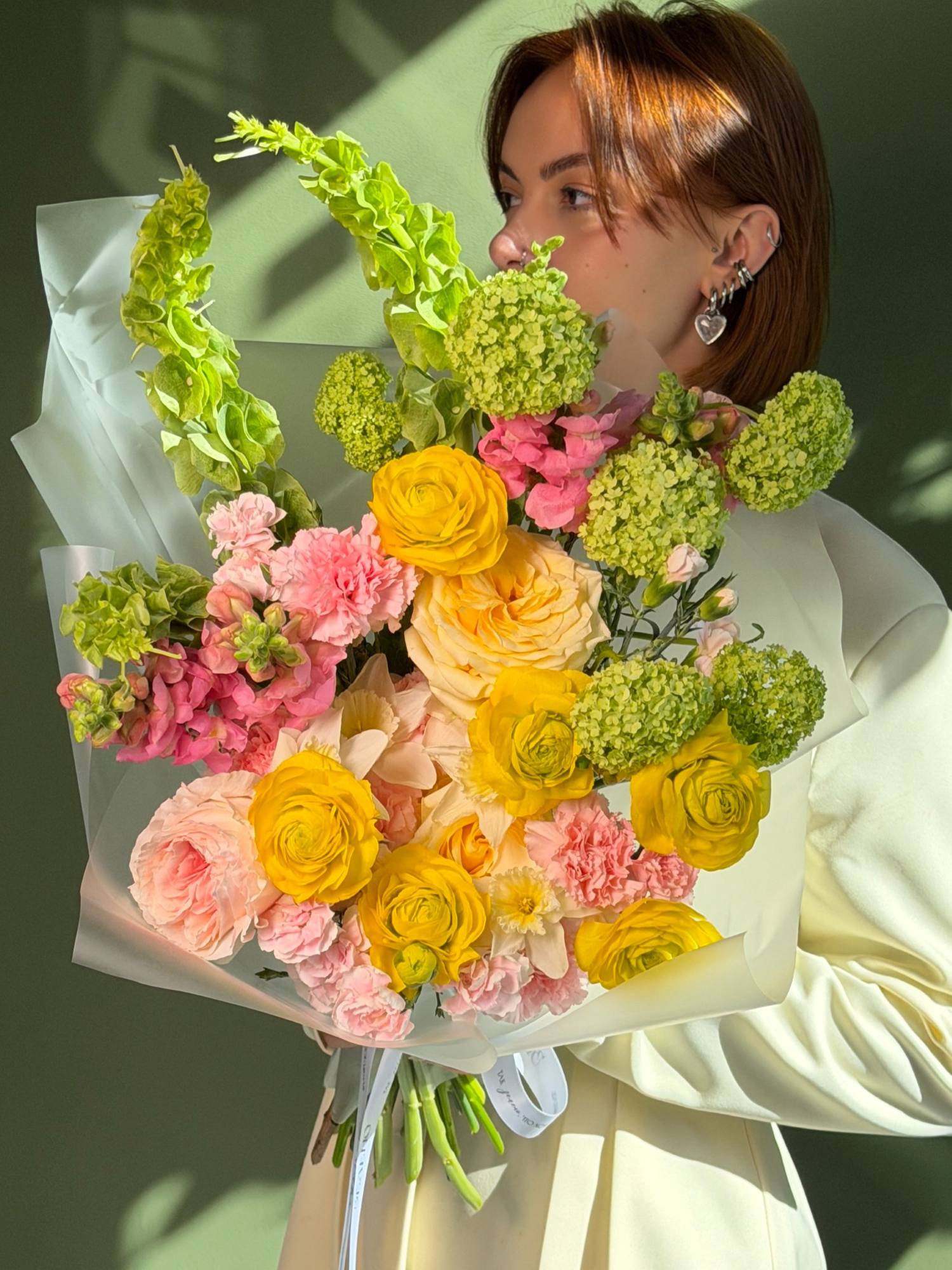 | В составе | Вибурнум, Гвоздика, Леувенбек, Молюцелла, Нарцисс, Ранункулюс, Роза пионовидная |