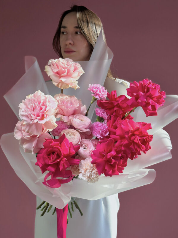 | В составе | Гвоздика ,Гербера ,Ирис ,Лилия ,Ранункулюс ,Роза кустовая ,Роза французская |