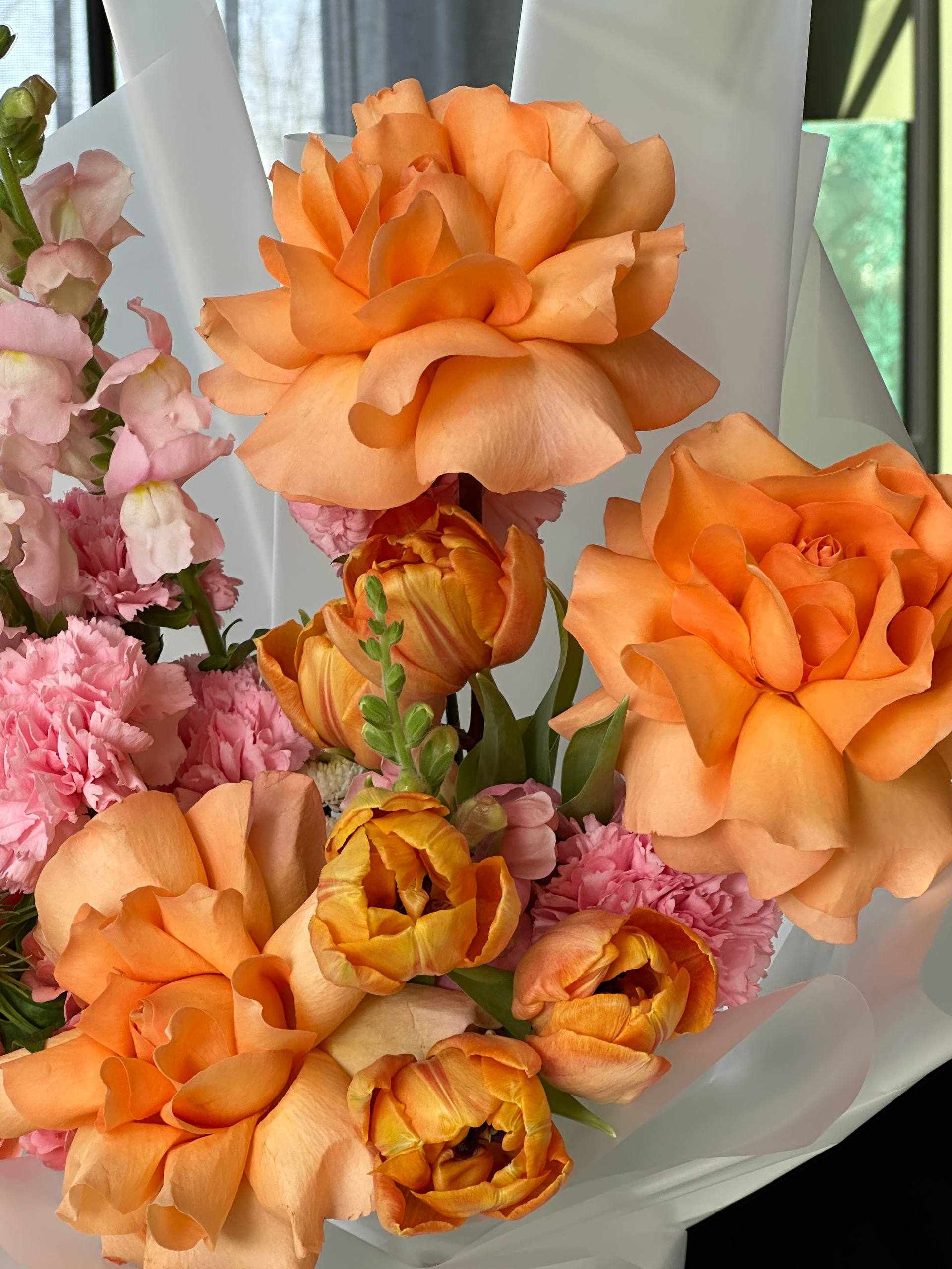 | В составе | Гвоздика, Леувенбек, Пионовидные тюльпаны, Роза пионовидная, Роза французская, Тюльпан |