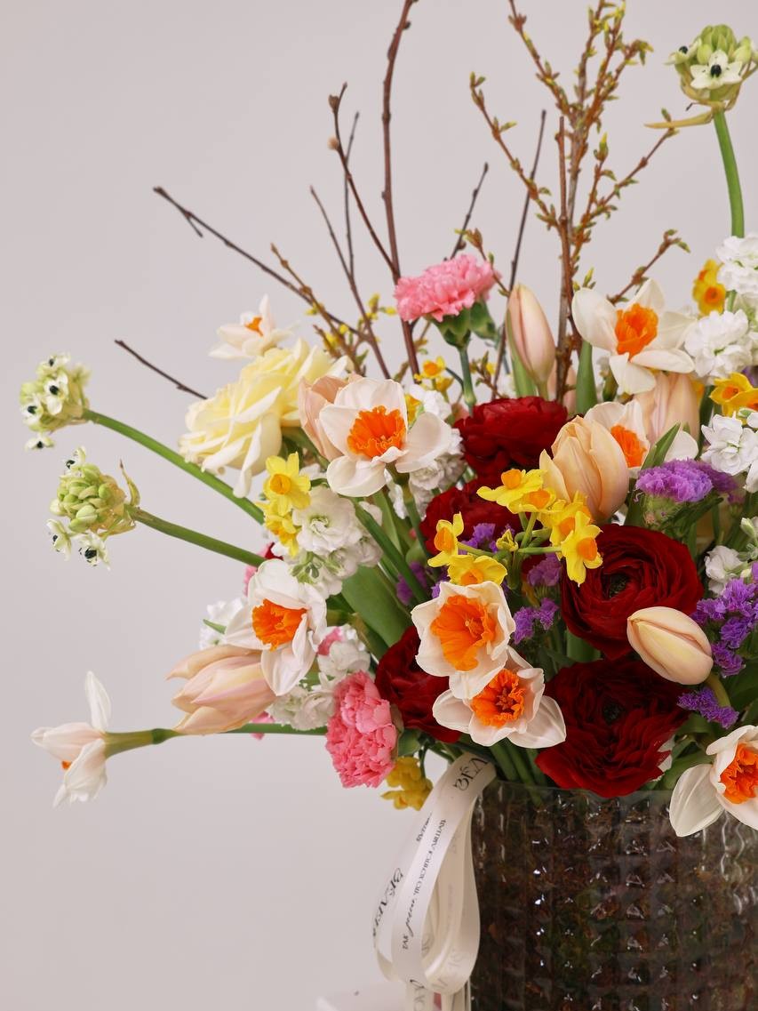 | В составе | Гвоздика ,Маттиола ,Мох ,Нарцисс ,Орнитогалум ,Ранункулюс ,Роза французская ,Статица ,Тюльпан ,Форзиция |