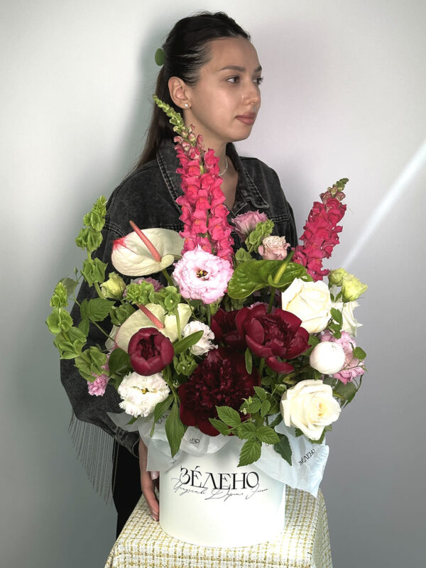 | В составе | Антуриум ,Гвоздика ,Гермини ,Гортензия ,Дельфиниум ,Леувенбек ,Лизиантус (эустома) ,Малина ,Молюцелла ,Пион ,Роза французская |