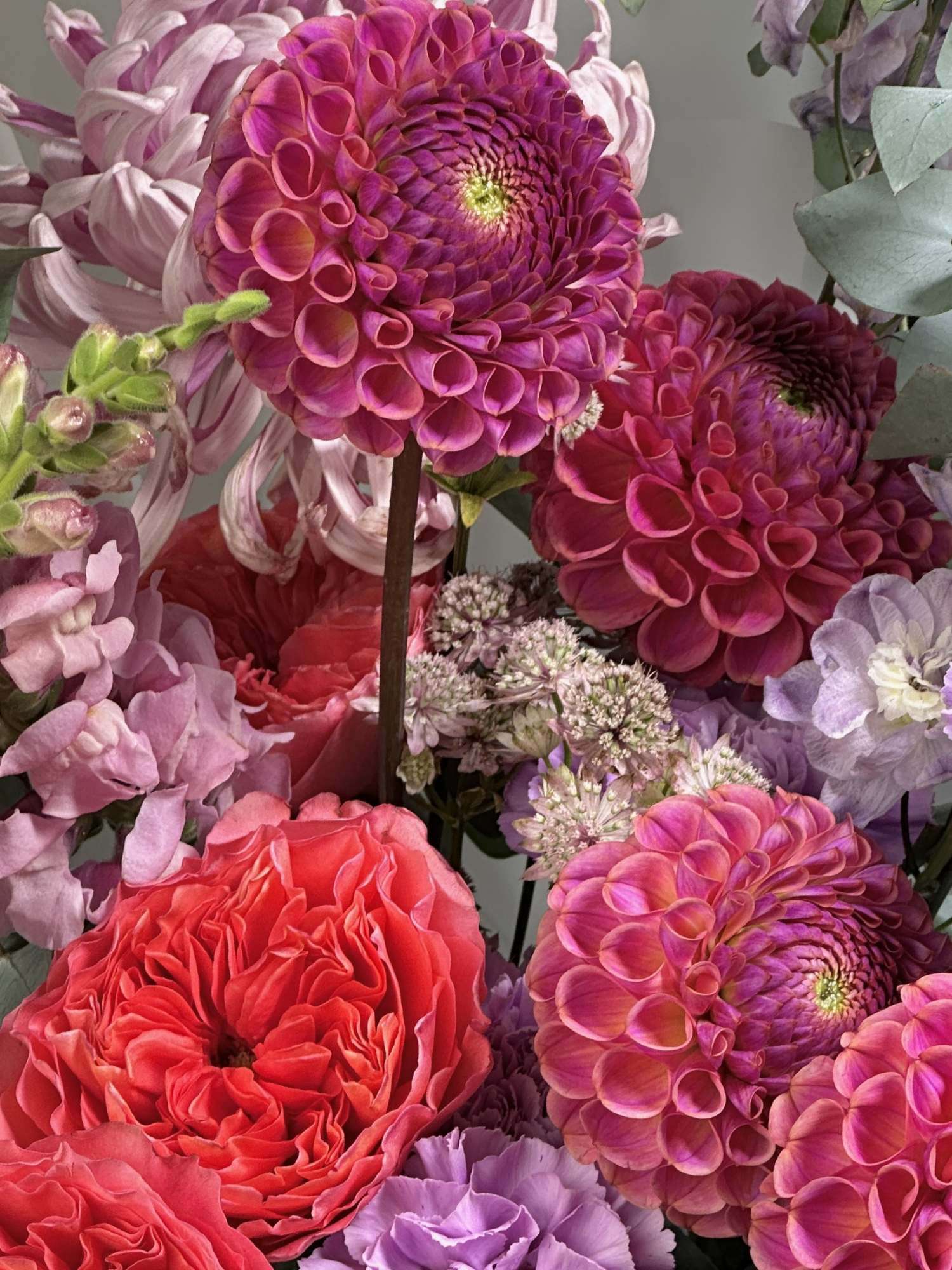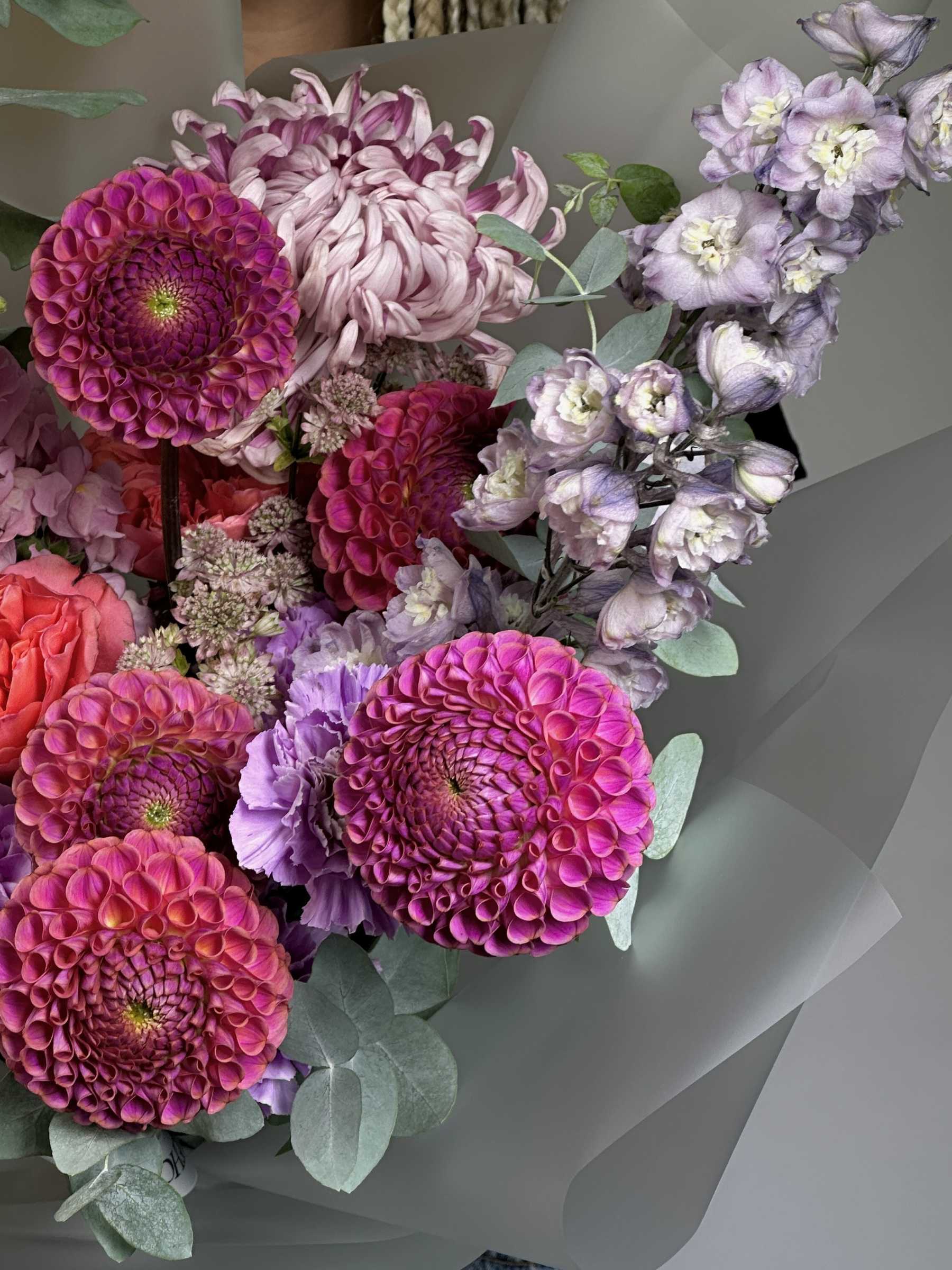 В составе | Астранция ,Гвоздика ,Георгин ,Дельфиниум ,Леувенбек ,Роза пионовидная ,Хризантема ,Эвкалипт |