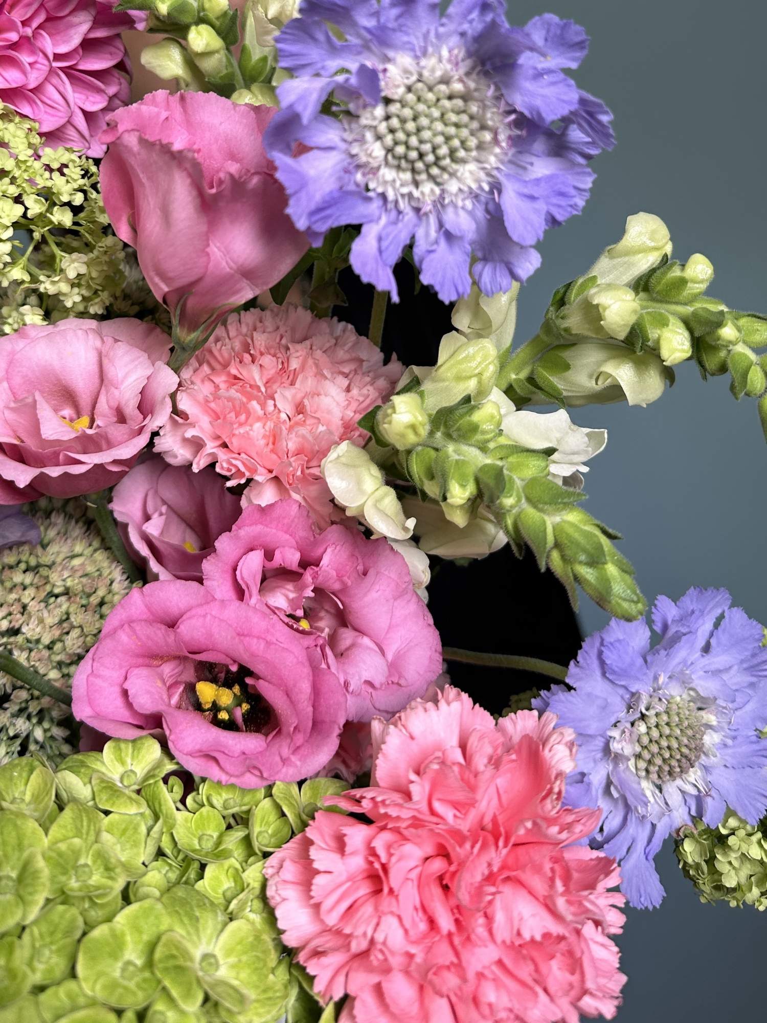 В составе | Вибурнум ,Гвоздика ,Георгин ,Гортензия ,Дельфиниум ,Леувенбек ,Лизиантус (эустома) ,Нерине ,Скабиоза |