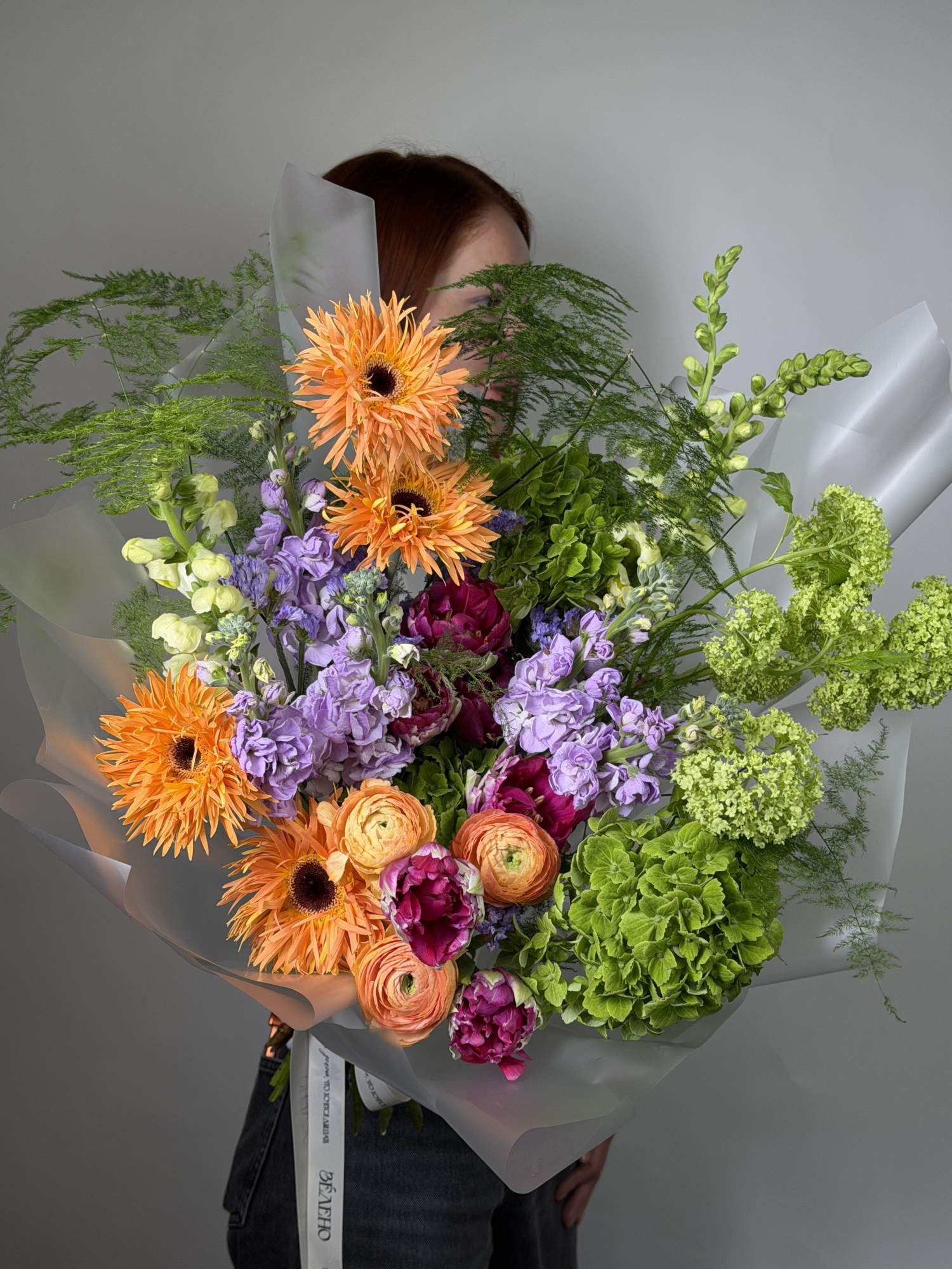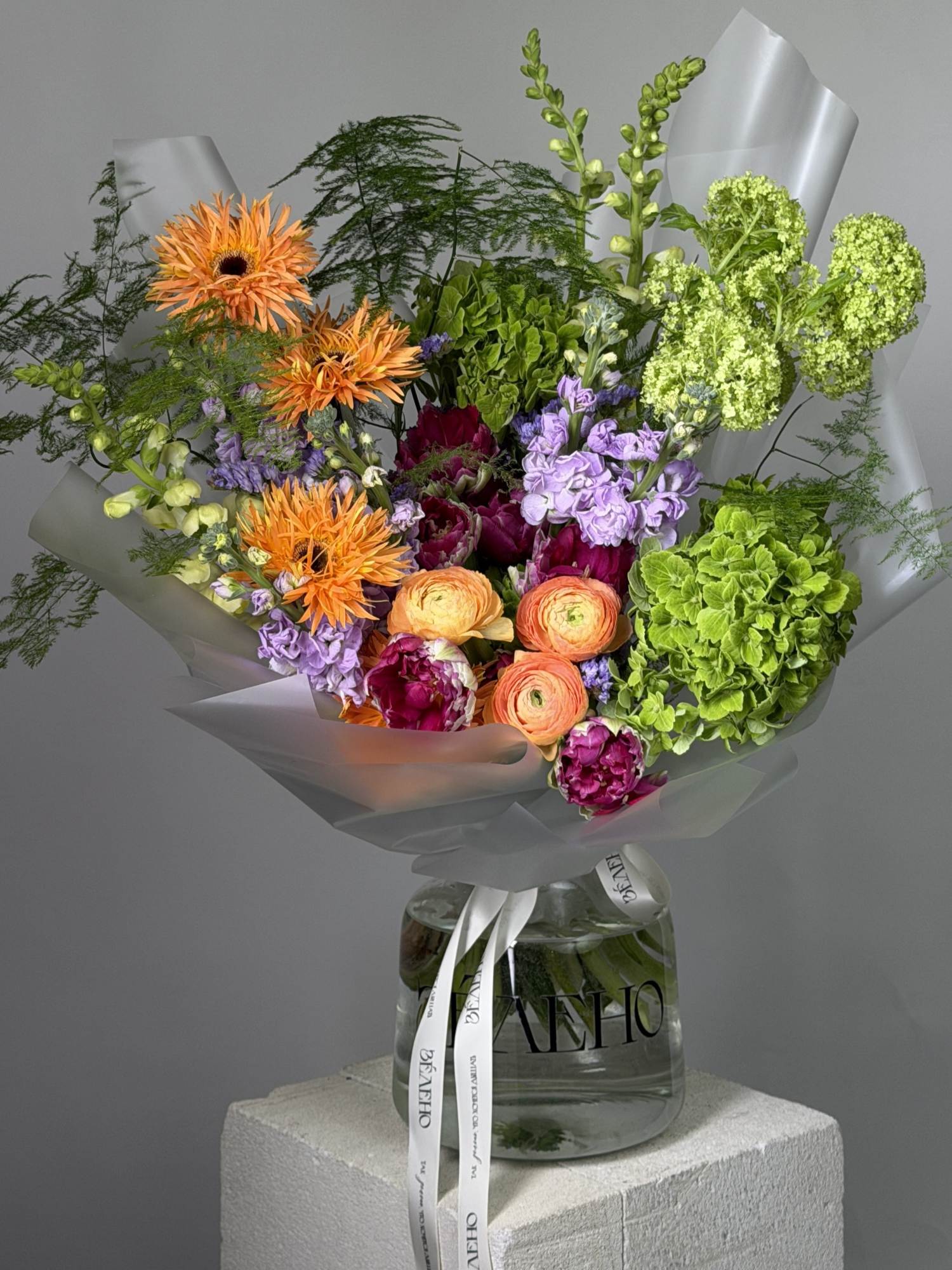 | В составе | Аспарагус, Вибурнум, Гербера, Гортензия, Леувенбек, Маттиола, Пионовидные тюльпаны, Ранункулюс, Статица |