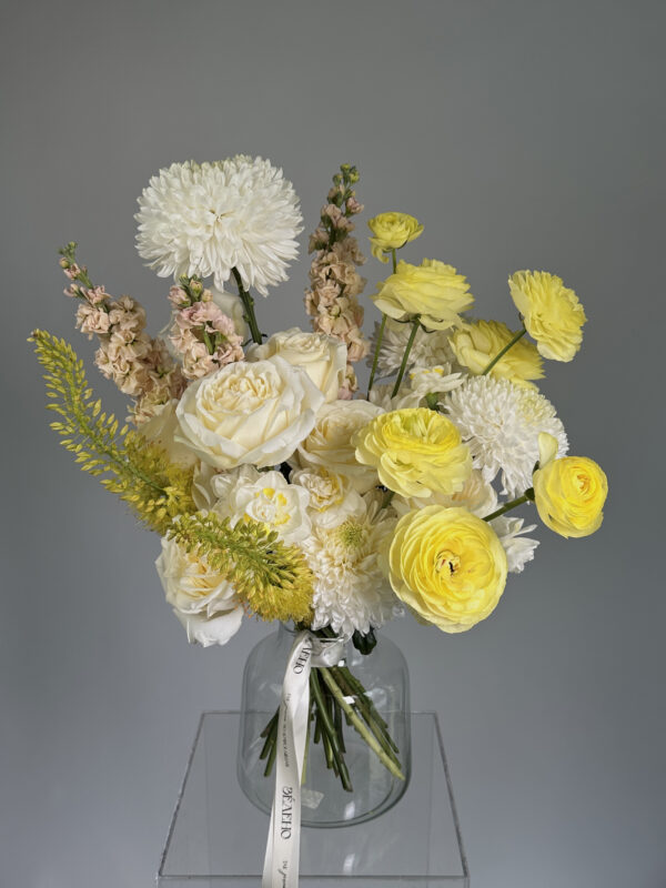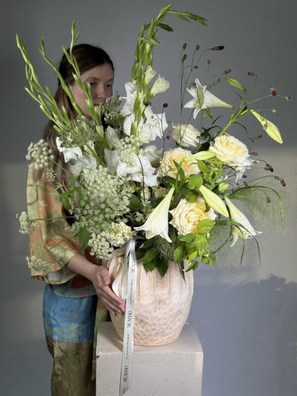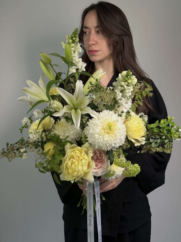 | В составе | Калла ,Краспедия ,Леувенбек ,Лилия ,Молюцелла ,Орнитогалум ,Пион ,Роза пионовидная ,Хризантема |