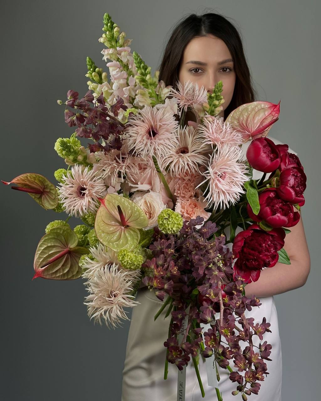 Свежесть мая, собранная в композицию из фритиллярий, пионов, вибурнума, гербер, антуриумов, пионовидных роз, гвоздик, леувенбека — для тебя.